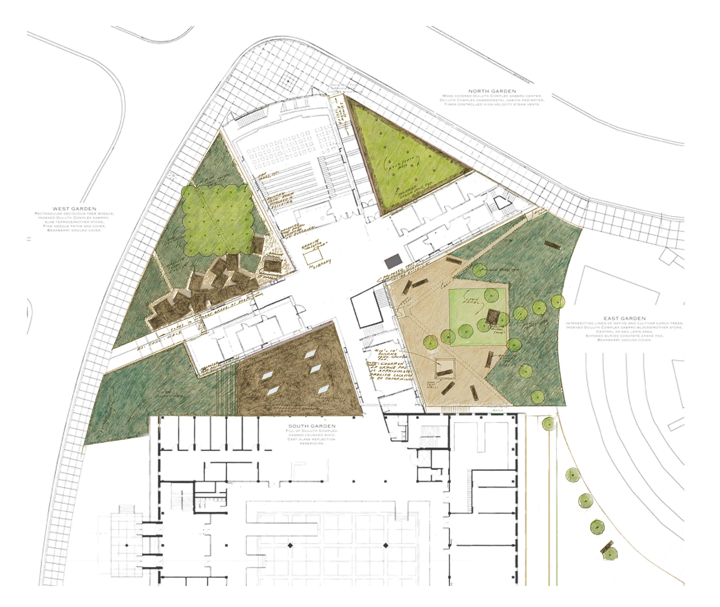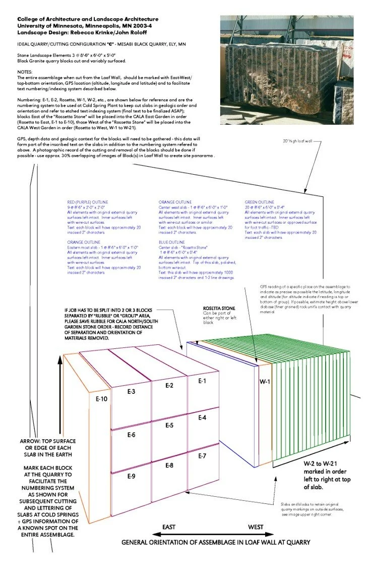 Research into the site revealed that deep underneath Rapson Hall, a rift system connects it to northern Minnesota – including the Mesabi black granite quarry. A trip to this quarry resulted in the selection of two quarry blocks used, and to be used, in this project. The West and East Gardens each use one block, cut into different shapes. The North and South Gardens use (respectively) remnants and crushed Mesabi Black.