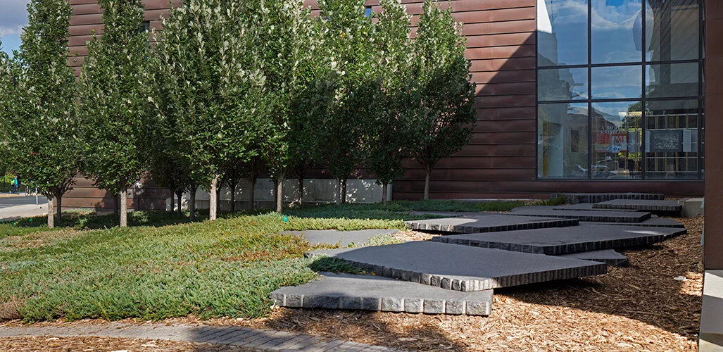 A grid of 18 trees provides vertical counterpoint, seasonal change, shade, and refers to ideas of human habitation such as groves or plantations. The trees are unusual - a hybrid of swamp white oak and English oak. They attract a lot of attention due to being an uncommon species and being planted closely together. Together these qualities provide for a unique experience on campus of walking through a grove as well as being able to admire the grove from afar as a kind of living sculpture. The groundcovers are still knitting into place and increasingly provide a low textural mat, staying low enough to allow the stacked edges of the slabs to read. A “floor” of groundcover is very unusual in the sea of lawn that is campus.