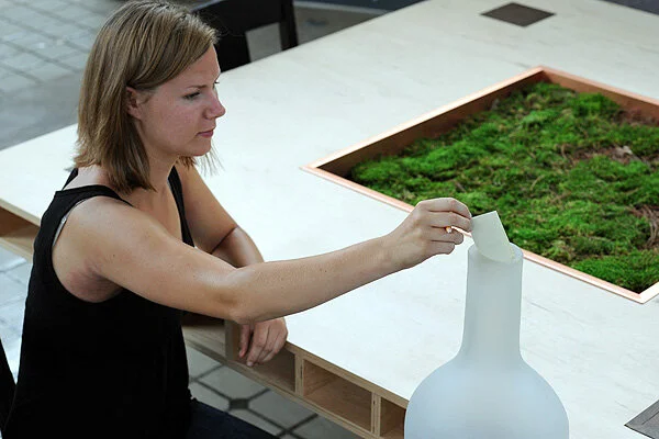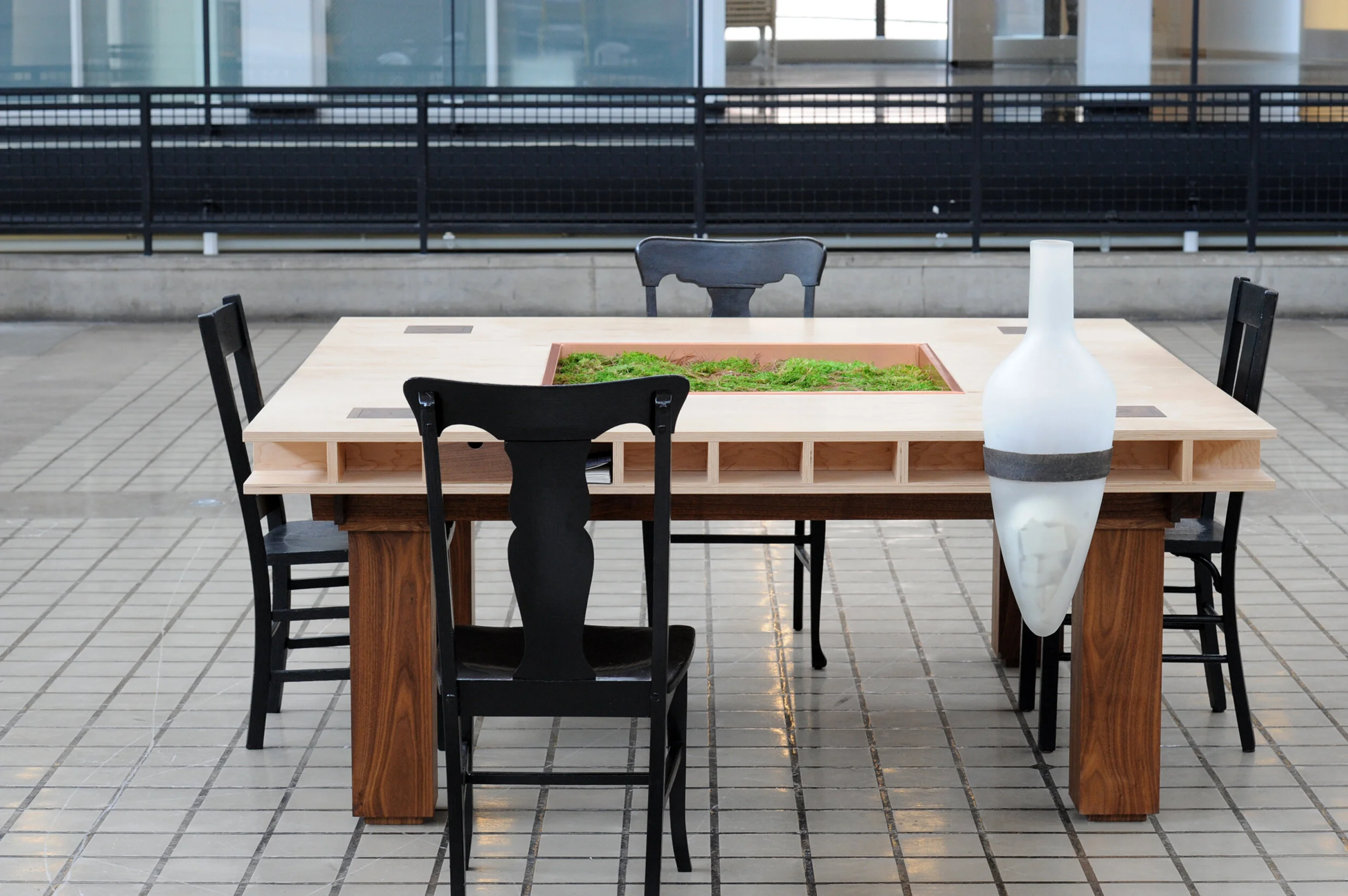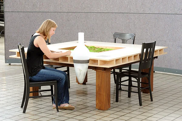 The Table for Contemplation and Action is located in the interior public courtyard of Rapson Hall on the University of Minnesota campus and is in virtually continuous use by students. The six foot square wooden table has a central copper box containing a changing unusual element from the outdoors (to date, pine needles, bark, leaves, moss, beach stones and driftwood). The table also provides students with the opportunity to write about fear/stress/worries and to deposit these writings into the table’s blown glass vessel. Slips of paper and pencils are provided in the table’s drawers. When the vessel is full, the papers are emptied and burned without reading.