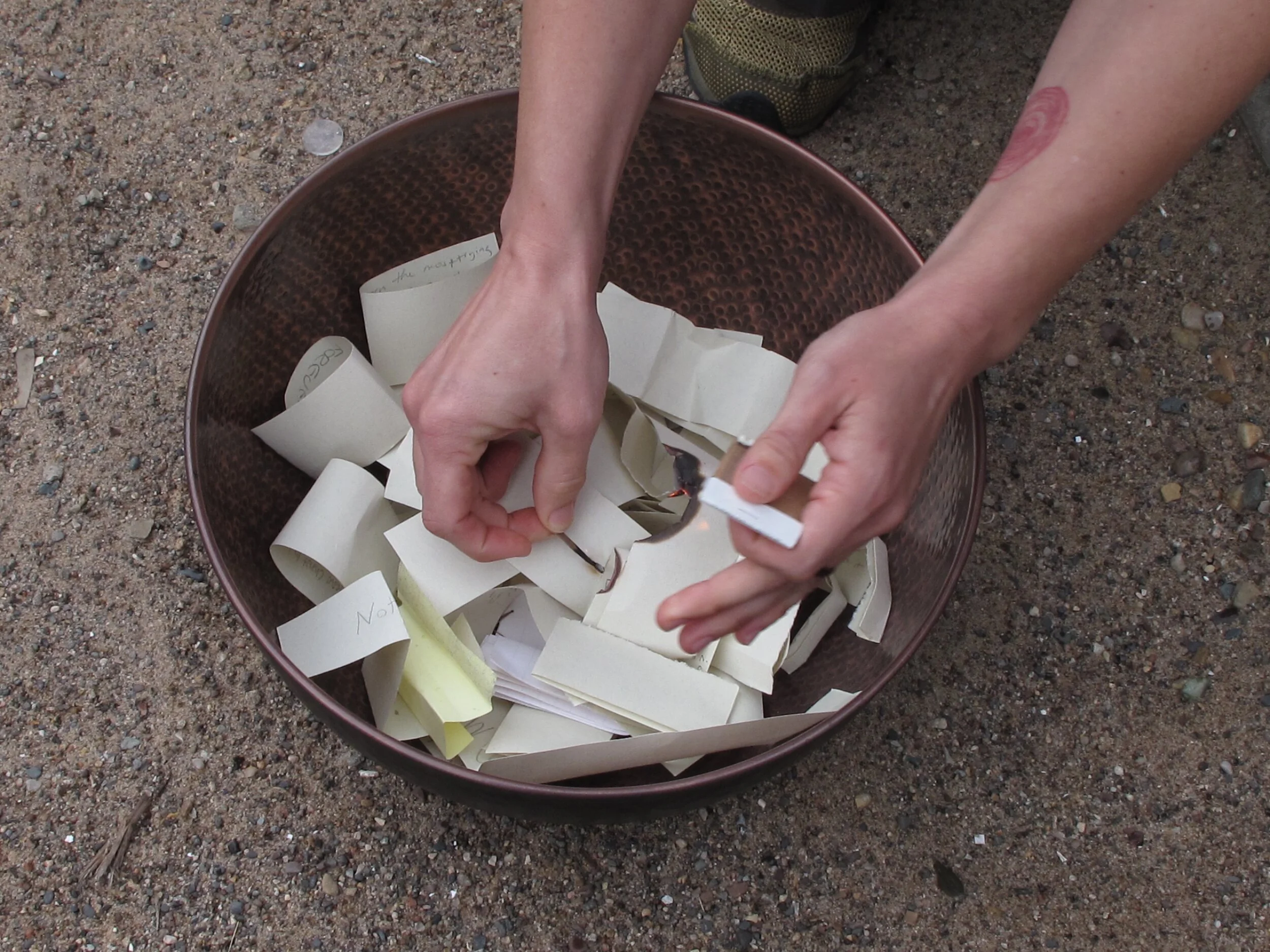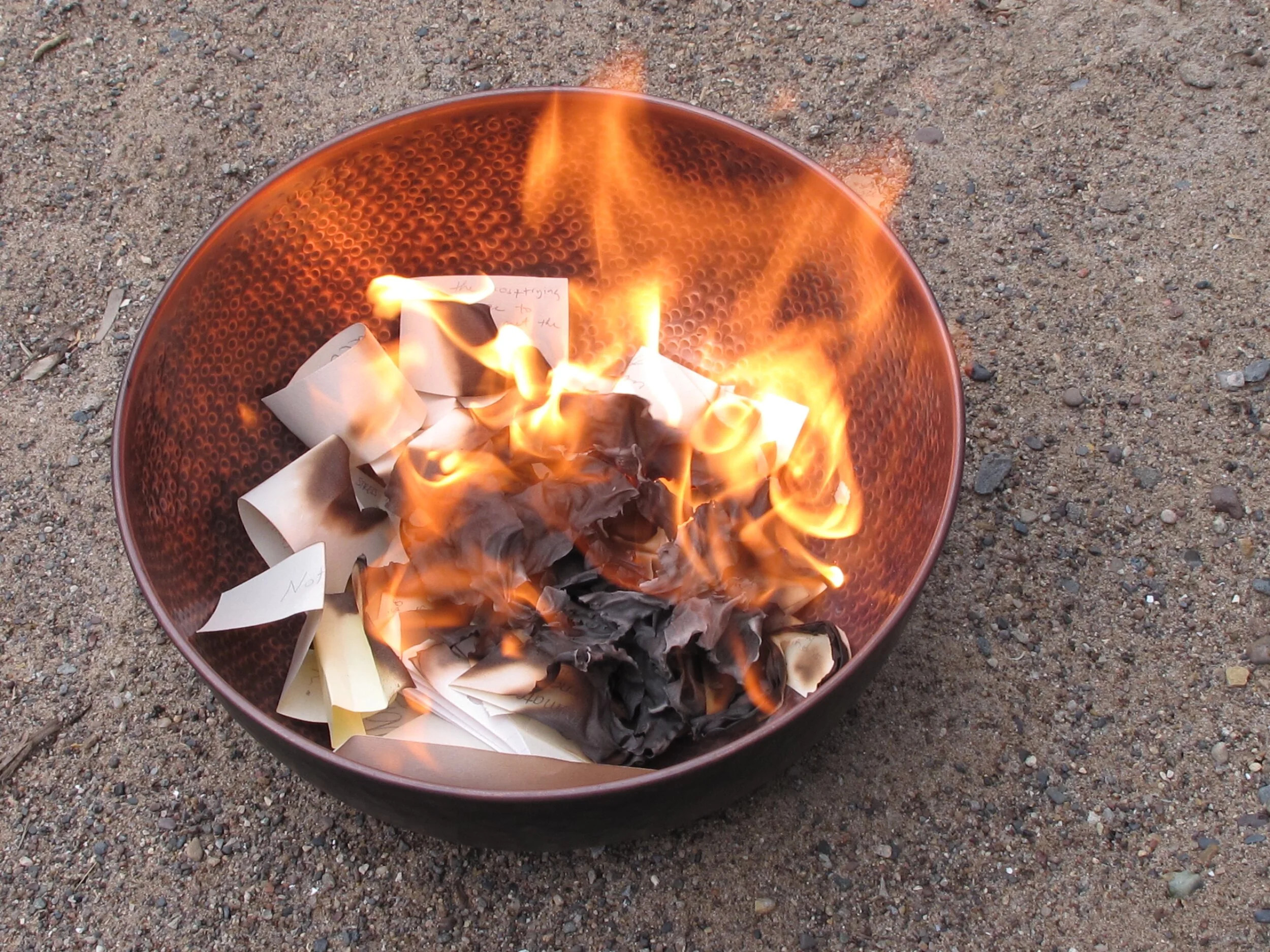 The vessel’s writings have been burned once. The burning is announced in advance and all are invited to participate or witness: there were about a dozen people (students and faculty) at the initial burning. The vessel is now very full and another burning will take place in October 2010.